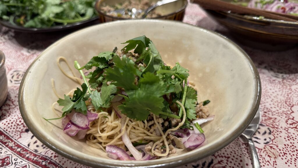 海老の卵を入れて作った蝦麺というものを知って、エスニックのまぜそばを作ってみたら、あら美味しい。